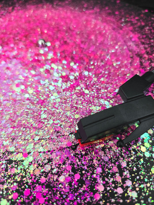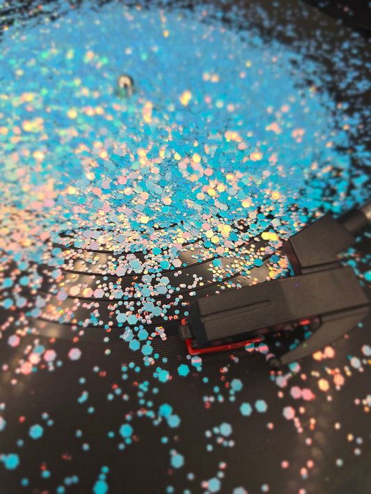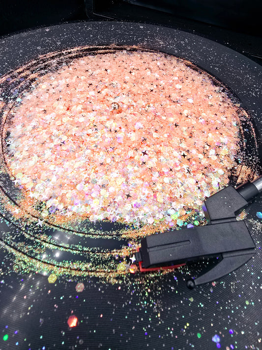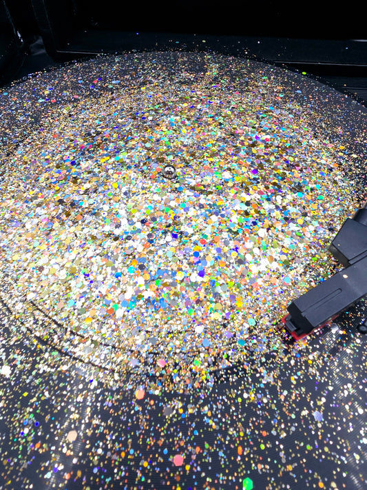 A collection of various shapes and types of glitter. Large, Medium and fine cuts mixed to make a blend of cuts that will dazzle your next project.