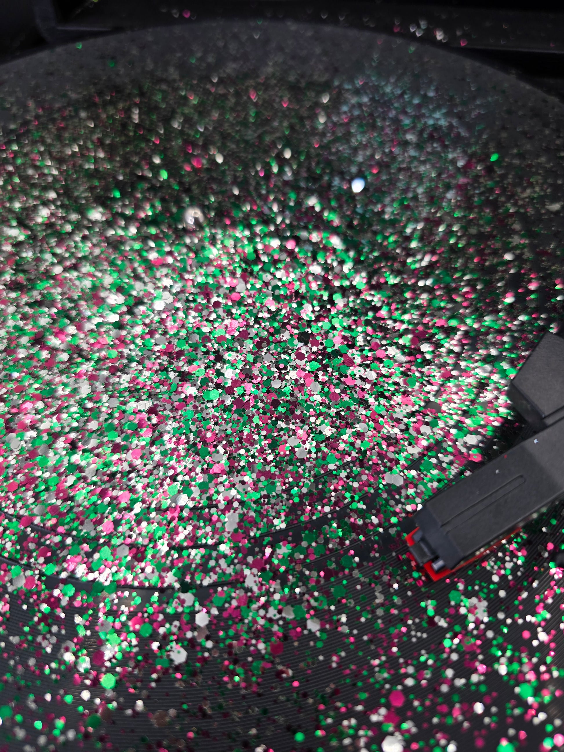 Solvent resistant glitter.