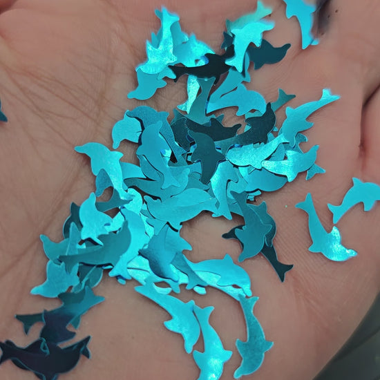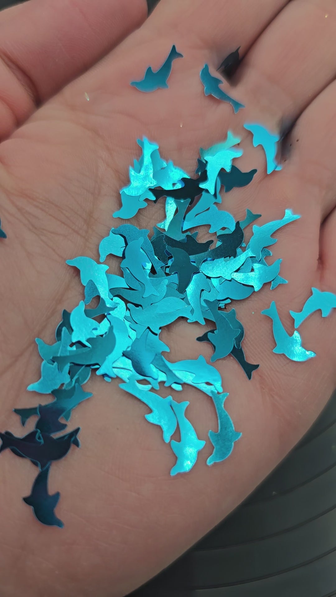 Metallic polyester glitter shaped as cute dolphins. Perfect for snow globes, story boards and shaker keychains.