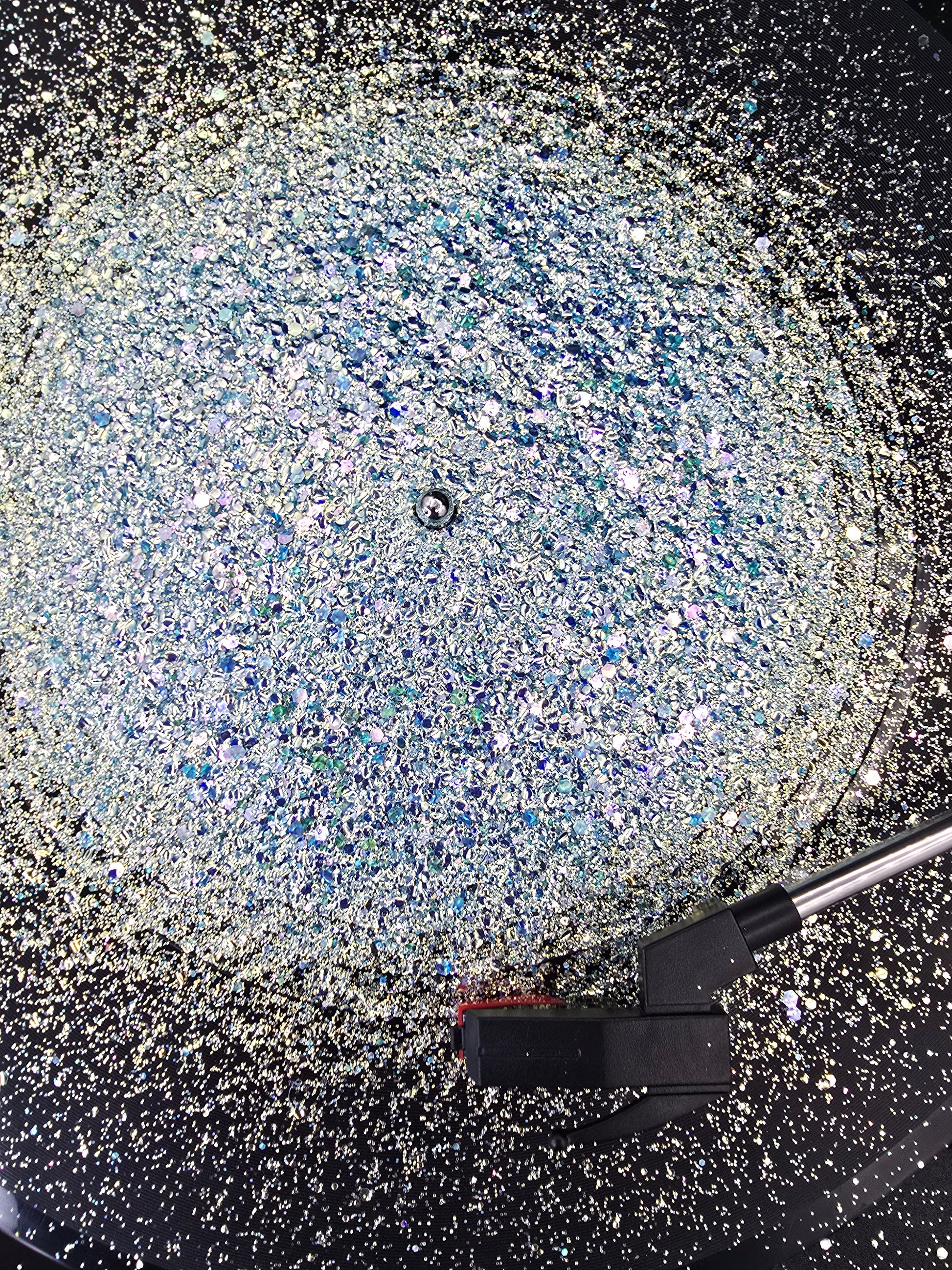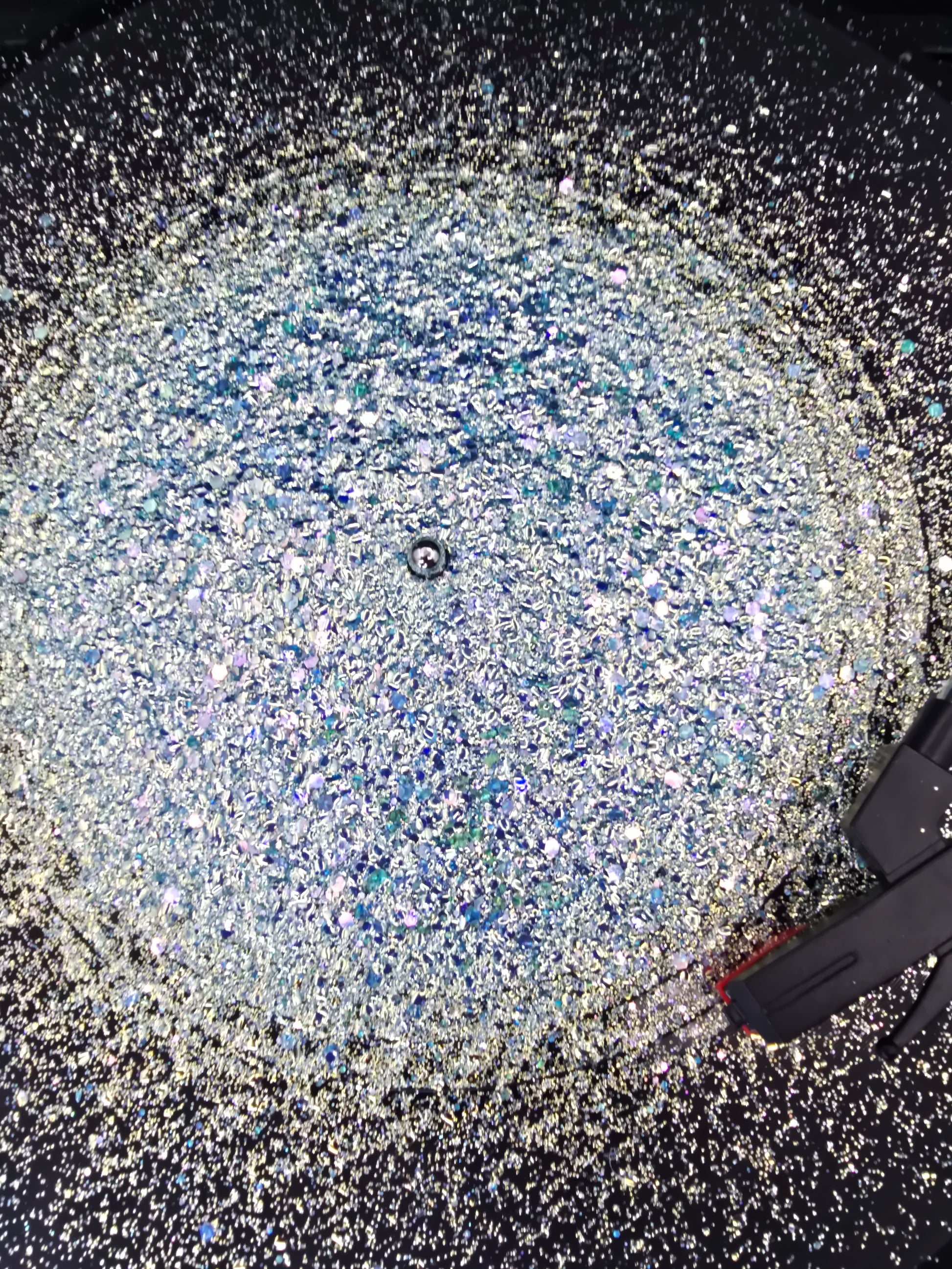 Mid size cut beat drops glitter. Little droplets of shift blue with green gold shift.